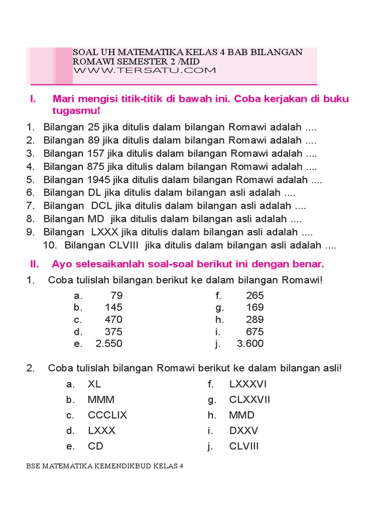 Apabila angka disebelah kiri kurang dari angka di sebelah kanan bilangan itu dikurangi. Cara penulisan angka romawi dan tabel. Vii kunci jawaban soal ulangan harian matematika kelas 4 sd bab 6 bangun datar. Jika suatu angka diikuti oleh angka yang nilainya lebih besar dari pada nilai angka itu, maka nilai angka yang mengikutinya itu harus dikurangi dengan nilai angka yang diikuti tadi. I, v, x, l, c, d, m. Cara mengkombinasikan simbol angka romawi akan dijelaskan secara lengkap dalam artikel ini. Angka romawi atau bilangan romawi adalah sistem penomoran yang berasal dari romawi kuno. Angka romawi biasanya digunakan untuk penomoran buku, serial film, bahkan penomoran seri event olahraga seperti olimpiade dan lain sebagainya. Angka ini dulu digunakan oleh bangsa romawi kuno. Kelas i, kelas ii, kelas iii, kelas iv, kelas vi. Sistem penomoran pada bilangan romawi memakai huruf latin untuk melambangkan angka numerik. Angka romawi merupakan suatu hal yang sangat penting dalam kehidupan, karena sejak dahulu angka romawi ini telah biasa digunakan. Documents similar to bilangan romawi 2 kelas iv sd.