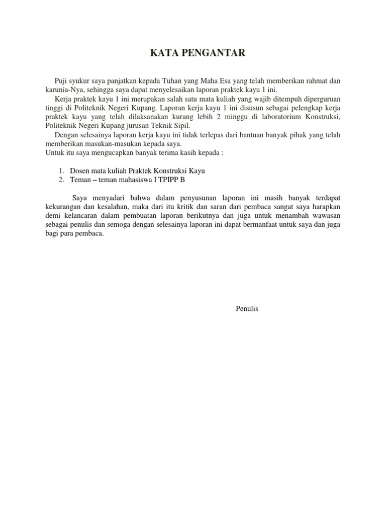 Documents similar to laporan praktek kayu 1 politeknik negeri malang. Puji dan syukur kehadirat allah swt. Mahasiswa dapat memahami langkah kerja yang baik dalam mengetam dan. Amalan keselamatan di bengkel kerja kayu kejuruteraan. Tetapi secara khusus dan utama laporan praktek kerja batu ini di peruntukkan bagi mahasiswa jurusan teknik sipil politeknik yang ingin memahami lebih lanjut tentang tata cara kerja batu. Mahasiswa dapat mengenal dan memahami peralatan manual yang digunakan untuk mengetam dan menggergaji.2. Amalan kepatuhan di bengkel kayu adalah penting terutamanya bagi pelajar pmk yang. Laporan praktek kerja lapangan ini (pkl) menjelaskan bagaimana proses dalam pelaksanaan pembangunan gedung belajar dari mulai pemancangan tiang pancang, pemasangan bekisting, pemasangan tulangan dan pengecoran pada setiap struktur bangun. Bab ii prosedur pelaksanaan kerja sama. Laporan praktek bengkel kerja kayu,program study manajemen rekayasa konstruksi politeknik negeri malang. Kami akan menghapus komentar yang bertentangan. Laporan pembuatan kerajinan dari bahan keras. Ini buat yang habis pkl tak kasih contoh laporannya :